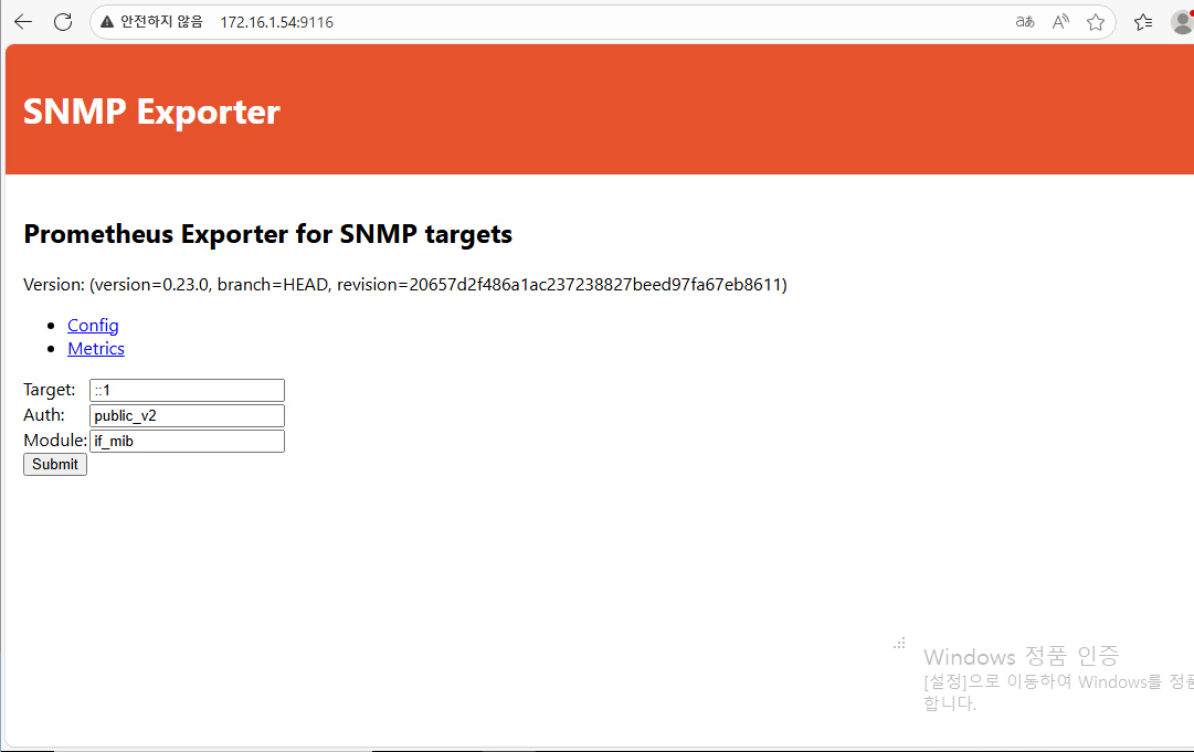 172.16.1.54:9116에 접속하여 SNMP Exporter가 정상 작동하는지 확인.