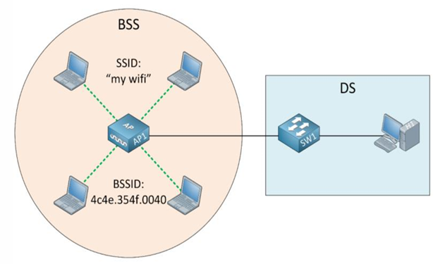 무선 네트워크의 가장 기본적인 단위로, 하나의 AP와 해당 AP에 연결된 무선 클라이언트로 구성된 논리적 서비스 영역입니다. 쉽게 말해, AP 하나가 제공하는 Wi-Fi 커버리지 영역 전체가 하나의 BSS입니다.