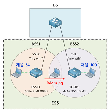 예를 들어, 1번 AP(BSS 1)와 2번 AP(BSS 2)의 이름을 모두 'Office_WiFi'로 설정하고 유선망(DS)에 연결하면, 사용자는 이동 중에도 끊김 없이 하나의 네트워크처럼 사용하게 됩니다.