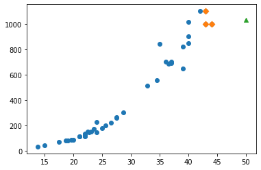 길이 50cm에 무게 1033g인 농어를 구분하기 쉽게 marker 매개변수를 '^'으로 지정하여 삼각형으로 표현하였고, 이 농어의 최근접 이웃을 마름모(marker='D')로 표현하였다.