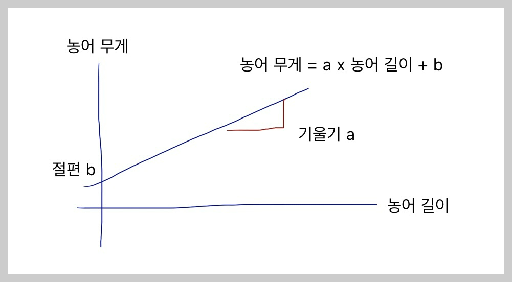 여기서 x를 농어의 길이, y를 농어의 무게로 바꾸면 위의 그림과 같다.