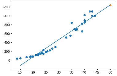 plt.scatter(50, 1033, marker='^') # 50cm 농어는 삼각형