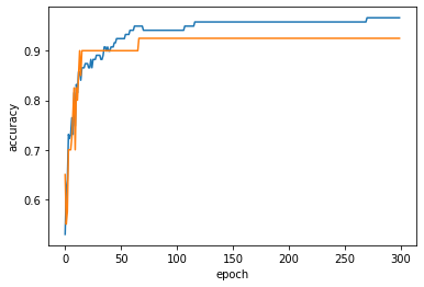 또한 에포크마다 훈련 세트와 테스트 세트의 점수를 기록하기 위해 2개의 리스트를 준비했다.
