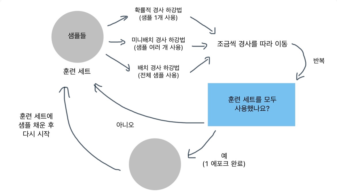 4. 에포크: 확률적 경사 하강법에서 전체 샘플을 모두 사용한 한 번의 반복